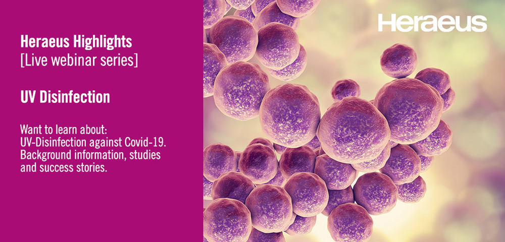 Each webinar is available in German or English. Registration for one or more in the series is now available at Heraeus Highlights: UV Disinfection webinars as well as the agenda and speaker details.