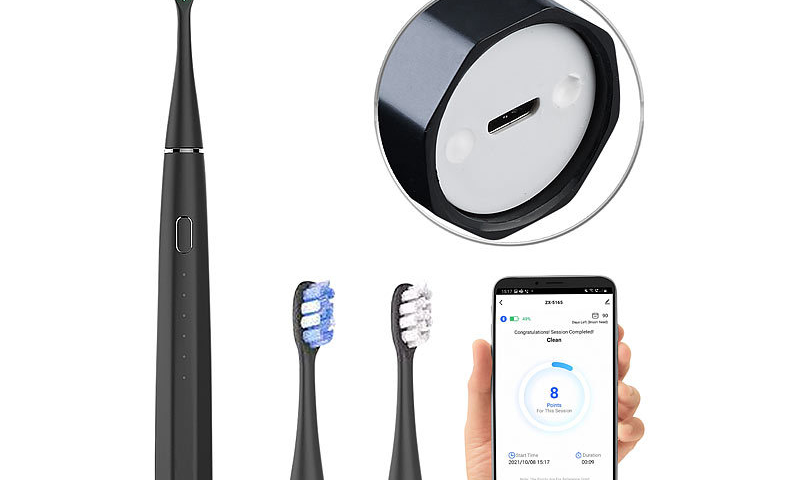 – Schallzahnbürste SZB-200.app inklusive 3 Bürsten-Köpfen (weich, mittel, hart), USB-Ladekabel und deutscher Anleitung