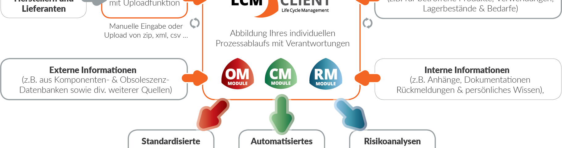 AMSYS gestaltet die reaktiven, proaktiven und strategischen Obsoleszenzmanagement-Prozesse automatisiert, digitalisiert und nachvollziehbar mit dem webbasierten Life Cycle Management (LCM) Client. Der LCM Client wird individuell auf die Nutzer abgestimmt und die drei Module werden einzeln oder zusammen betrieben. Im Fokus steht die zentrale Verwaltung des individuellen Obsoleszenzmanagements, um digital und proaktiv den Überblick über Abkündigungen und Änderungen zu behalten, in Verbindung mit internen und externen Datenquellen.