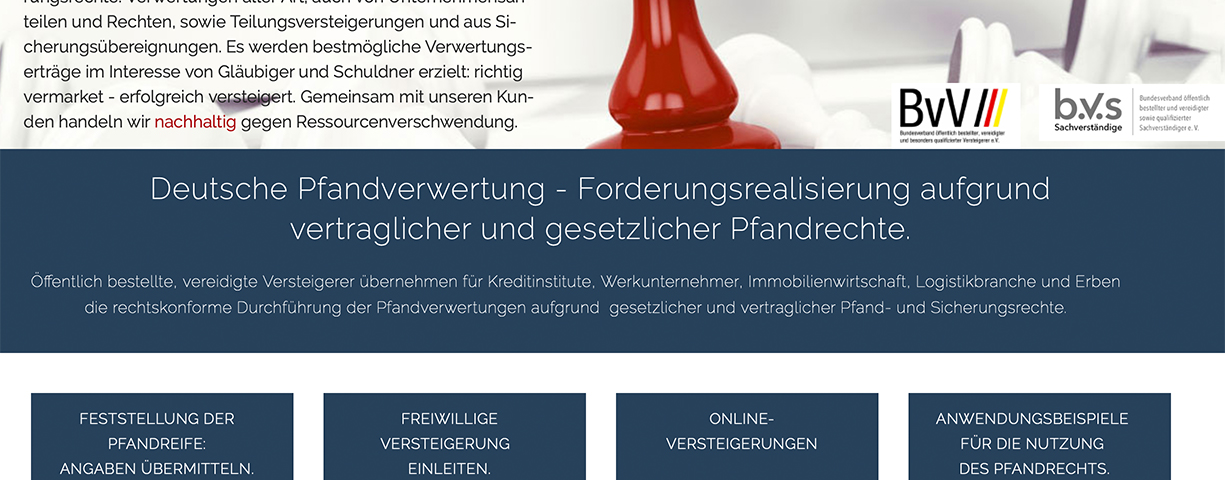 Pfandrechtsverwertungen sind das Spezialgebiet der allgemein öffentlich bestellten, vereidigten Versteigerer. Als praxiserfahrene, gut vernetzte Experten arbeiten sie schnell und effizient. Die Bestimmungen der Zivilprozessordnung und die GVGA für Gerichtsvollzieher sind für öffentlich bestellte Versteigerer, die nach BGB und HGB arbeiten, nicht einschlägig, denn der Gesetzgeber beabsichtigt eine kaufmännisch flexiblere und effizientere Gestaltung des Verwertungsverfahrens.
