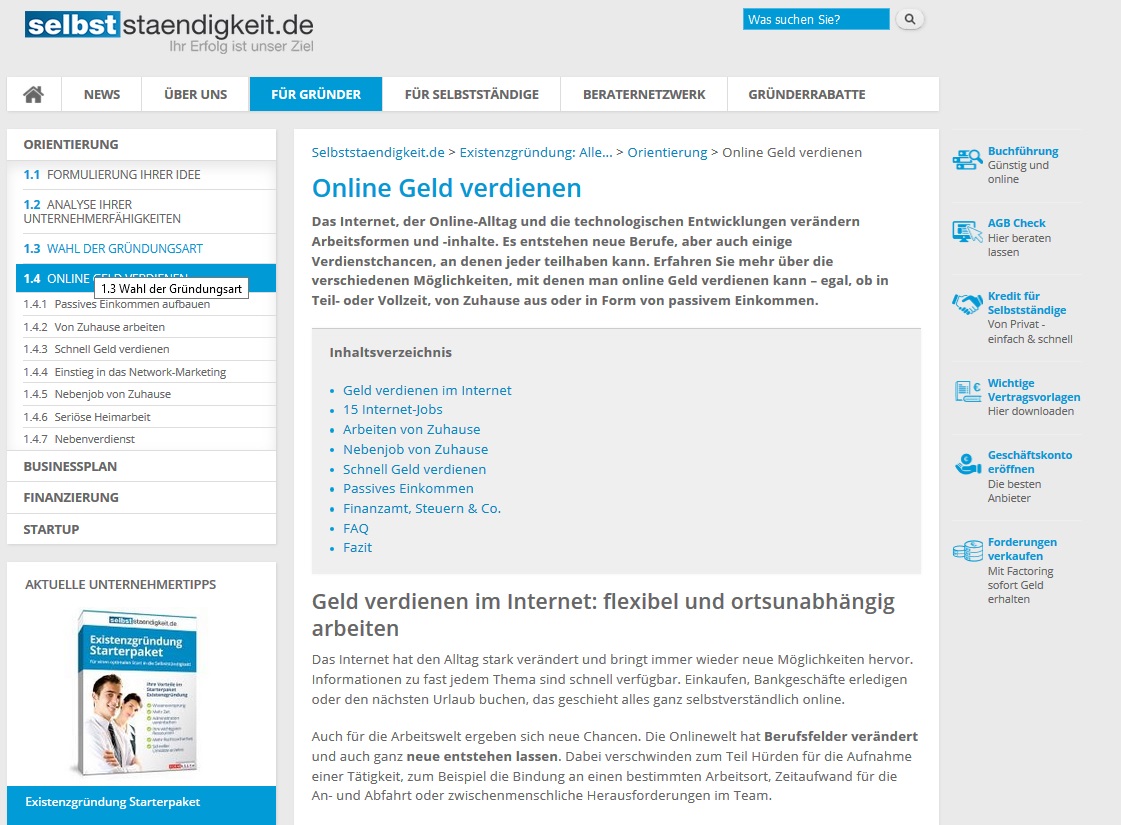 Das Internet bietet viele Möglichkeiten, mit denen online Geld verdient werden kann. Neue Berufe haben sich gebildet, die auch als Dienstleistungen zu vermarkten sind. Deshalb zeigt die Onlineplattform selbststaendigkeit.de ihren Zielgruppen der Gründer, Selbstständigen und Freiberuflern sowie den Unternehmern auf, welche Chancen sich ihnen mit dem Aufbau von Onlinegeschäften bieten, und berät sie bei der Findung von Entscheidungen und dem Aufbau von Geschäftsfeldern, wie online Geld zu verdienen ist. Dabei spart sie die Angebote des passiven Einkommens nicht aus und beleuchtet die kleinen Varianten der selbstständigen Nebenjobs und der Selbstständigkeit in Teilzeit. Auch wer den „schnellen Euro“ machen will, findet auf selbststaendigkeit.de entsprechende Angebote, um online Geld zu verdienen.