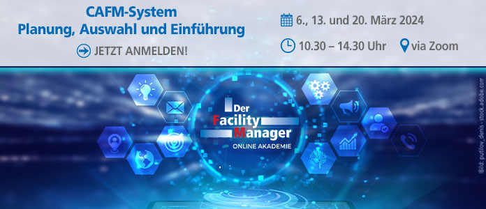 Die Herausforderung, ein Computer-Aided-Facility-Management-System auszuwählen, einzuführen oder zu wechseln, ist zugleich eine Herausforderung, dieses zeitlich und wirtschaftlich in vertretbarem Rahmen umzusetzen. Um Verantwortliche mit ihrem CAFM-Projekt auf der sicheren Seite zu halten, gibt es den bewährten CAFM-Online-Lehrgang der „Der Facility Manager Online-Akademie“.