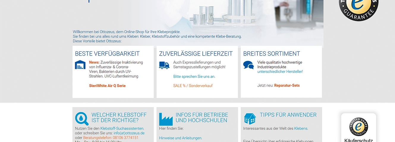 Unsere Zukunft ist digital. Das haben wir schon 2007 erkannt und unseren Onlineshop www.ottozeus.de ins Leben gerufen. Dort erhalten unsere Kunden alle hochwertigen Klebstoffmarken, das passende Zubehör, viele wichtige Informationen und bei Bedarf auch eine telefonische Klebeberatung – alles schnell und zuverlässig, so wie es von einem Onlineshop erwartet wird. Das umfangreiche Klebstoff-Sortiment auf www.ottozeus.de umfasst knapp 1000 Artikel, die sowohl für Gewerbekunden aus Handel, Handwerk und Industrie, als auch erfahrene Heimwerker 24/7 bestellbar sind.