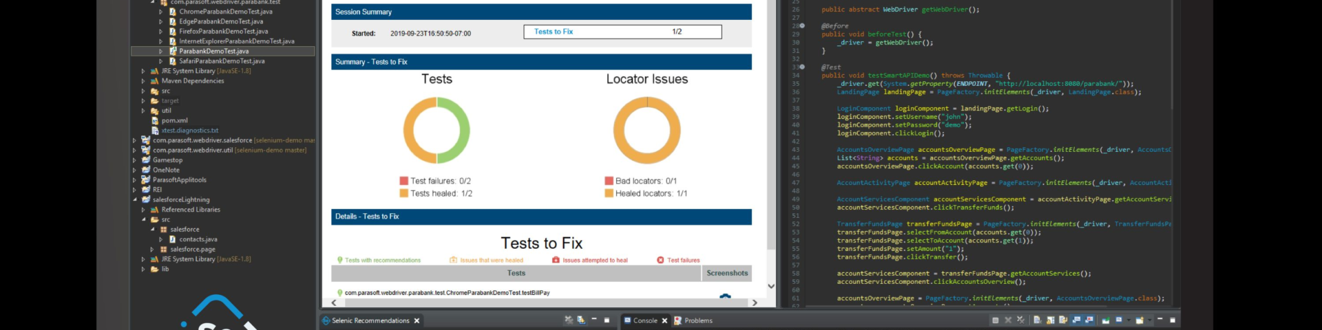 Parasoft Selenic ist ein AI-gestütztes UI-Testtool, das direkt mit Selenium Testsuiten arbeitet und sich in eine bestehende CI/CD-Pipeline integrieren lässt. Es bietet eine Selbstheilung der Selenium-Skripte zur Laufzeit und automatische Empfehlungen, die den Anwendern helfen, die fehlerhaften Test nach Abschluss der Tests zu reparieren, die dann wieder direkt in die IDE einfließen, um die Selenium-Skripte automatisch zu aktualisieren. Zudem enthält Parasoft Selenic ein Plug-in für die Erstellung intelligenter UI-Tests, das reine Java-basierte Selenium-Tests aufzeichnet und generiert, unter Nutzung des Page-Object-Modells für maximale Wartungsfreundlichkeit der Tests.