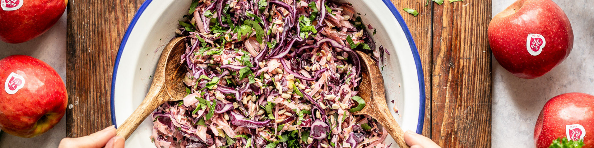 „Ein Gericht voller Geschmack und zusätzlich auch noch Gesundheit – das ist mir immer besonders wichtig. Neben dem Weißkohl liefert in diesem Rezept vor allem der Rotkohl super viel Vitamin C – unser Cole Slaw deckt schon den täglichen Vitamin-C-Bedarf! Aber das ist längst nicht alles: Äpfel sättigen mit Ballaststoffen, sind zudem reich an Vitamin B und C, Kalzium, Kalium und Folsäure – ein wahrer Gesundbrunnen, der durch den Fruchtgehalt – aber dabei wenig Kalorien – täglich auf den Speiseplan gehört. Übrigens nicht nur, um den Doktor fernzuhalten, sondern auch wegen des erfrischenden Geschmacks von Pink Lady. Abgerundet wird das Rezept durch den Apfelessig, der den Stoffwechsel ankurbelt und das Immunsystem boostet. Und last but not least: Sonnenblumen- und Kürbiskerne machen dieses Gericht zu einem wortwörtlich kerngesunden Highlight!“