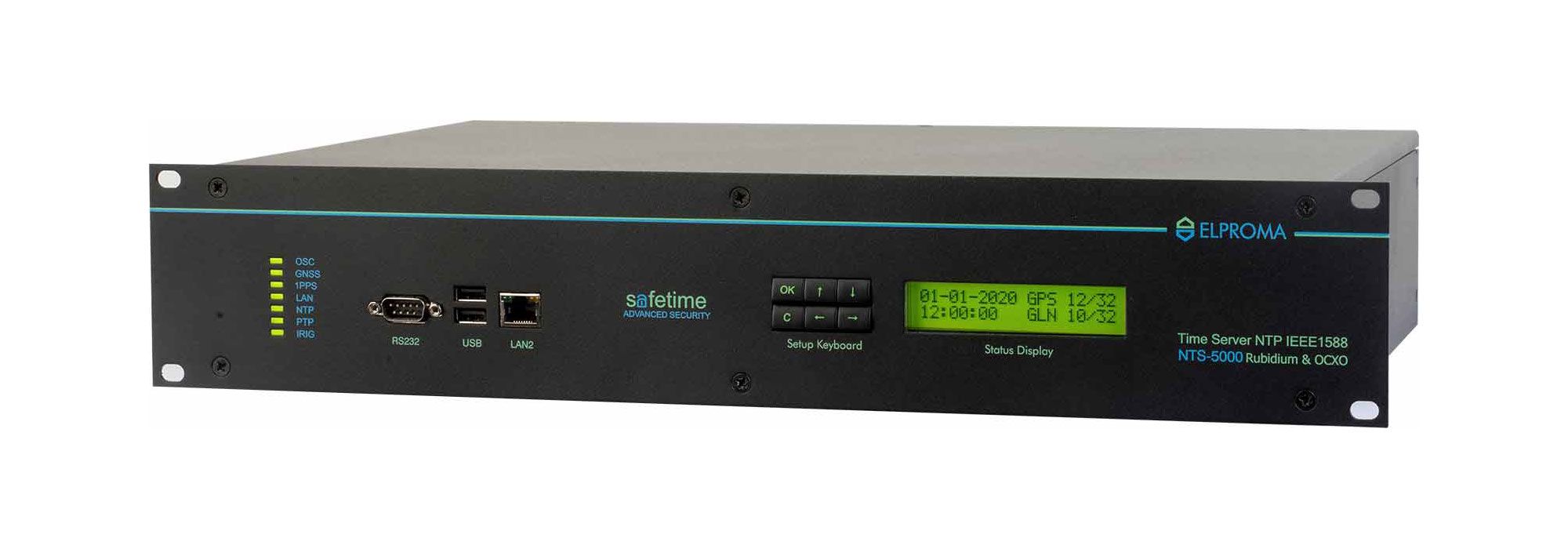 Der Time Server NTS-5000 bezieht seine genaue Zeit über einen Multi-GNSS-Empfänger. Ein zweiter GNSS-Antenneneingang ist vorhanden, dadurch wird ein redundanter Empfang auch unterschiedlicher GNSS (Global Navigation Satellite Systems) möglich. Dabei berücksichtigt der Timeserver die unterschiedlichen Zeitbasen von GLONASS, GPS, BEIDOU oder GALILEO. Ein hochstabiler OCXO in Kombination mit einem Rubidium-Standard sorgt dafür, daß die Zeit auch bei einem eventuellen GNSS-Signalausfall stabil weiter erzeugt wird. Für eine noch höhere Stabilität kann der NTS-5000 mit einer Cäasium-Atomuhr kombiniert werden.