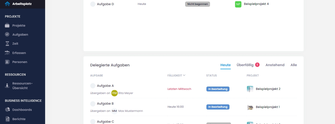 Der Arbeitsplatz in InLoox 11.6 dient als zentrale Anlaufstelle beziehungsweise Startseite für die gesamte Projektarbeit. Die Ansicht ist unterteilt in persönliche und delegierte Aufgaben. Für diese Aufgaben werden jeweils Kriterien wie Status, Fälligkeit und Projektzugehörigkeit angezeigt, um sie gegebenenfalls zu priorisieren und weiter zu organisieren, so dass sie strukturiert abgearbeitet werden können. Dazu gibt es im unteren Fenster der Arbeitsplatzansicht noch eine separate Übersicht für delegierte Aufgaben, die jeweils anderen Teammitglieder zugewiesen wurden.