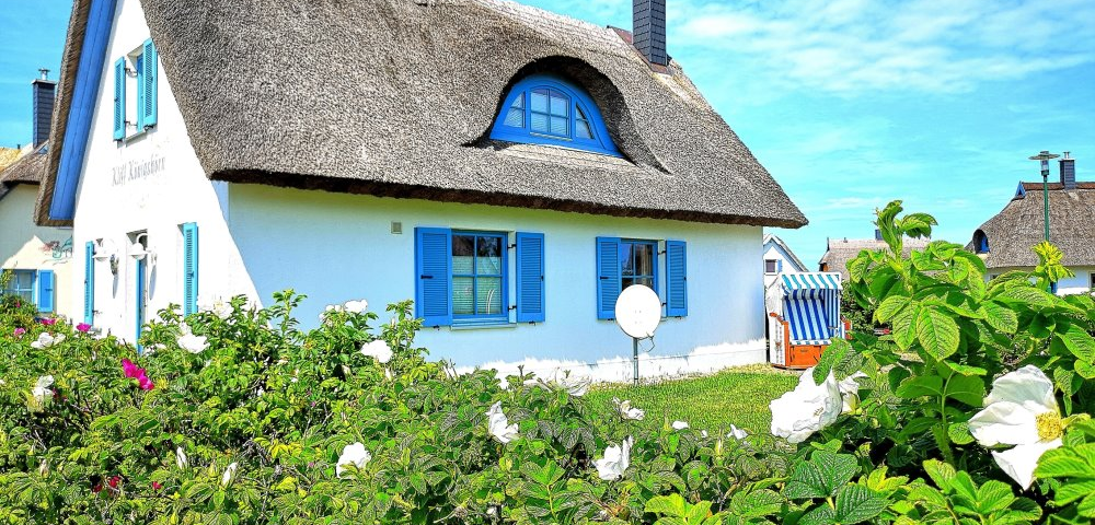 Herzlich willkommen in unserem Reethaus am Meer Kliff Königshörn mit Sauna Kamin Waschmaschine zwei Schlafzimmer zwei Bäder Wohn Essz Küche Terrasse mit Strandkorb Terrassenmöbel Sonnenliegen Sonnenschirm
