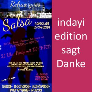 Bereits zum zweiten Mal innerhalb weniger Monate organisierte Monika Schelter, eine sehr engagierte und begeisterte Unterstützerin des Verlags indayi edition, einen Salsa-Abend mit dem Anliegen, Spenden zu sammeln. Nicht nur wurde freudig getanzt und ausgelassen gefeiert, sondern es kamen auch Spenden in Höhe von 500 € zusammen, wofür indayi edition sich auch im Namen von Dantse Dantse ganz herzlich bedanken möchte. Indayi edition schätzt diese finanzielle Hilfe sehr und wird die gesamte Summe in die Veröffentlichung von Dantse Dantses Bücher investieren.