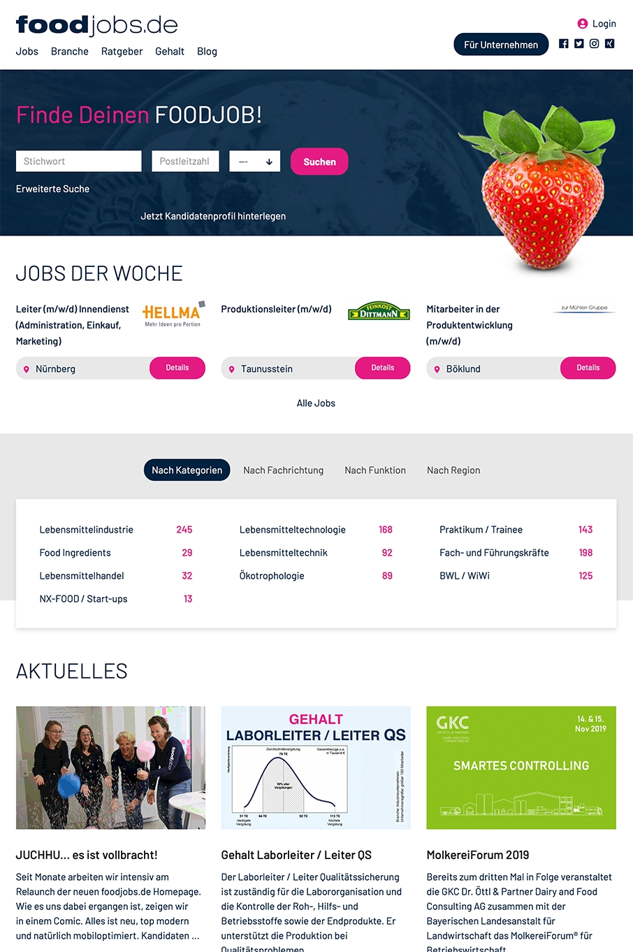 Im verflixten siebten Jahr erhöht foodjobs.de mit dem Relaunch ihrer Website die Chancen für Kandidaten und Unternehmen in der Lebensmittelwirtschaft auf die bestmögliche Passung. Karriere in der Food-Branche fängt bei foodjobs.de an: Die Jobbörse zeichnet sich nach ihrem Relaunch aus durch ein zielgerichtetes Suchen und Finden mit speziell angepassten Kategorien und Filtern, ein modernes Layout und bessere Übersichtlichkeit und Benutzerfreundlichkeit.