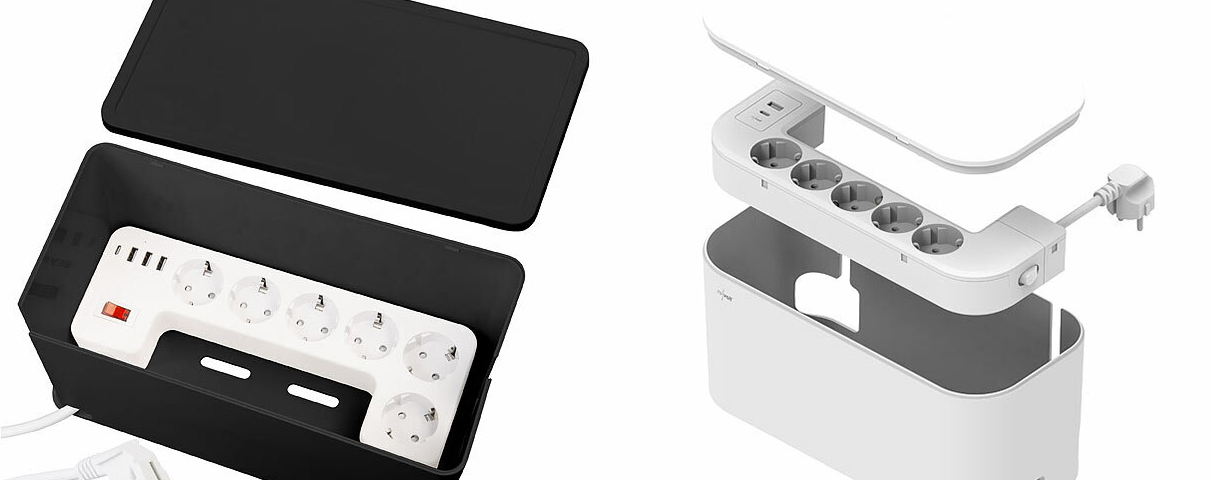 Staubschutz durch geschlossene Kabelbox: Die Steckdosen befinden sich in einer Kabelbox, die Steckplätze und Steckerverbindungen vor Staub schützt und das Kabelchaos beendet.
