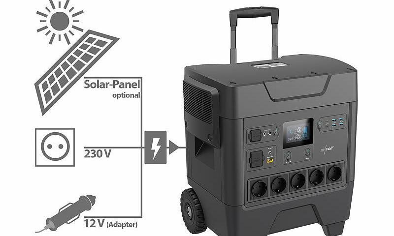 – Integrierter LiFePO4-Hochleistungs-Akku mit 3.248 Wh, lädt über 230 Volt, 12/24 Volt (Kfz) bzw.