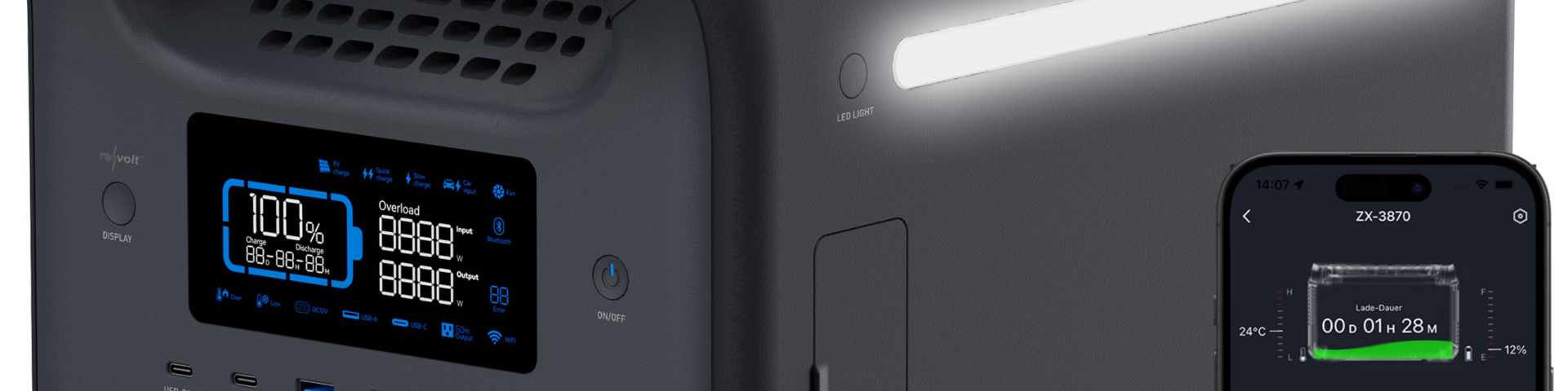 Vielseitige Stromversorgung für Garten und Notfälle: Die Powerstation von revolt versorgt Elektrogeräte zuverlässig mit Strom – sowohl im Garten als auch bei Stromausfällen. Drei Schutzkontakt-Steckdosen liefern bis zu 1.800 Watt Dauerleistung. Zusätzlich stehen vier USB-A-Ports mit bis zu 18 Watt und zwei USB-C-Ports mit bis zu 100 Watt für schnelles Laden von Mobilgeräten zur Verfügung. Ein Zigarettenanzünder-Anschluss und zwei Hohlstecker-Buchsen ermöglichen den Betrieb von 12-V-Geräten.