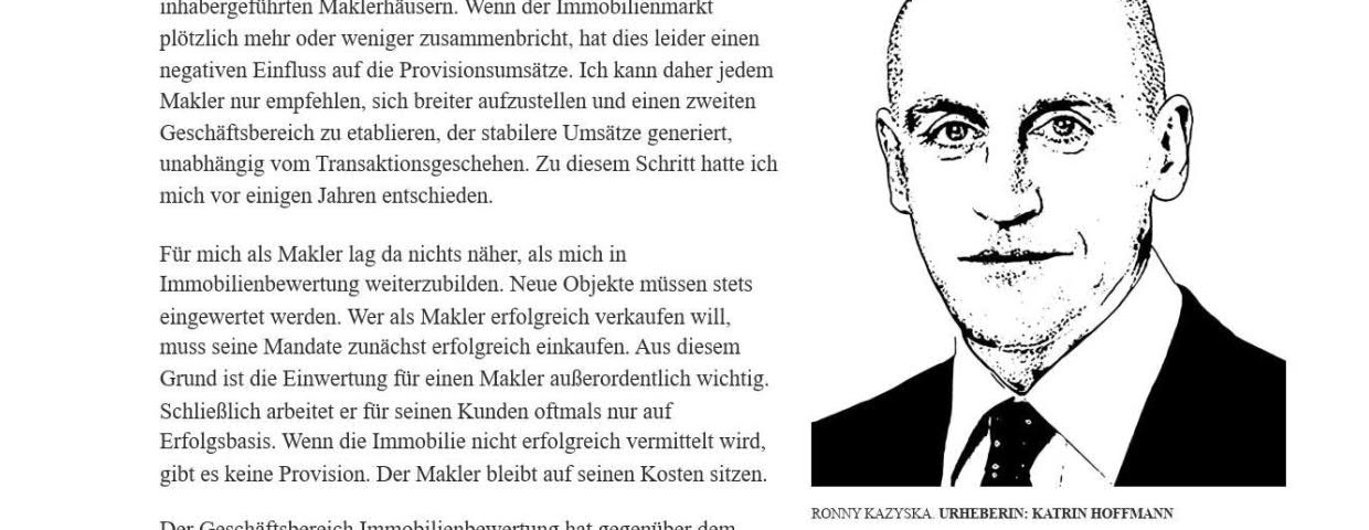 Ronny Kazyska empfiehlt Immobilienmaklern deshalb einen zweiten Geschäftsbereich zu etablieren, der stabilere Umsätze generiert, unabhängig von den Aktivitäten am Transaktionsmarkt. Er hatte selbst in der Vergangenheit berufsbegleitend nach einem immobilienwirtschaftlichen Bachelorstudiengang zusätzlich noch den Masterstudiengang Immobilienbewertung an der Hochschule Anhalt absolviert. Danach folgten als Sachverständiger für Immobilienbewertung zwei erfolgreiche Personenzertifizierungen nach der weltweit anerkannten internationalen Norm DIN EN ISO/IEC 17024 bei HypZert und der staatlichen Hochschule Anhalt (izert). Der Geschäftsbereich Immobilienbewertung ist weniger von den Aktivitäten am Transaktionsmarkt abhängig als dies im Vermittlungsgeschäft der Fall ist.