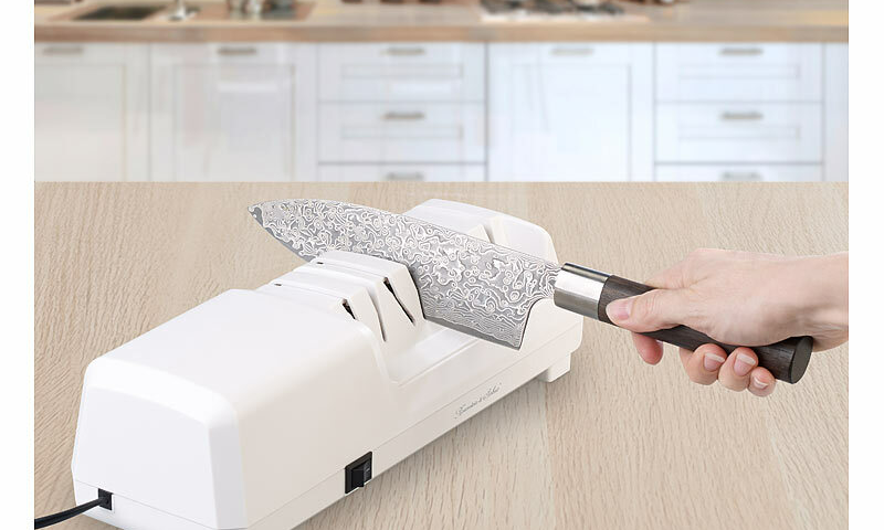 Mit dem elektrischen Diamant-Messerschärfer für Stahlklinken von Rosenstein & Söhne hat man mehr Freude beim Kochen: Die Messer schleift man einfach selbst und spart bares Geld. Und mit optimal geschliffenen Messern lassen sich Fleisch, Gemüse, Kräuter und mehr schneiden, ohne sich zu ärgern!