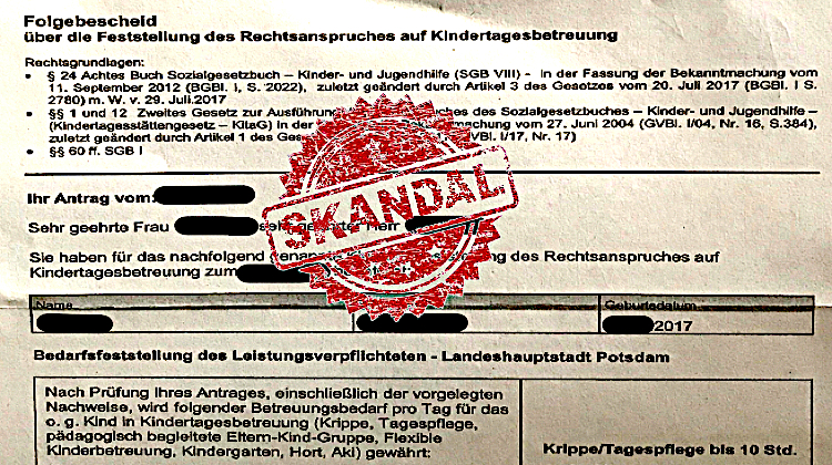 Despite many written requests from the parents of the severely disabled child, the mayor of Potsdam, Mike Schubert, together with his head of social affairs, Brigitte Meier, and the head of the department for health and social services, Uta Kitzmann, of the state capital Potsdam (the latter has appeared in the press several times in the past and is therefore considered a public figure), is responsible for the scandal that a small child with multiple disabilities can neither be supported nor receive the day care place to which he is entitled!