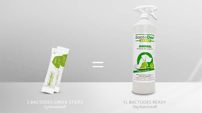 „Wir haben jetzt die ersten BactoDes®-Produkte im Sticksystem eingeführt. Den Start machen BactoDes® Green NeutralStick und AnimalStick. Mit dieser neuen Verpackungslösung sparen wir das 70-fache an Plastikmüll ein. Mir war es immer ein Dorn im Auge, dass wir für flüssige Produkte so viel Plastik benötigen. Jeder Liter brauchte bisher etwa 70 Gramm Kunststoff als Umverpackung. Die neuen Sticks haben im Vergleich nur noch ein Gramm Verpackung. Wir freuen uns, damit allen umweltbewussten Verbrauchern und Kunden eine zeitgemäße Alternative zu bieten und zeigen, dass auch Chemiehersteller grün sein können“, sagt Samuel Schneider, Inhaber von Schneiders Profichemie, zu den neuen Bio-Sticks Die neuen Bio-Sticks von Schneiders Profichemie.