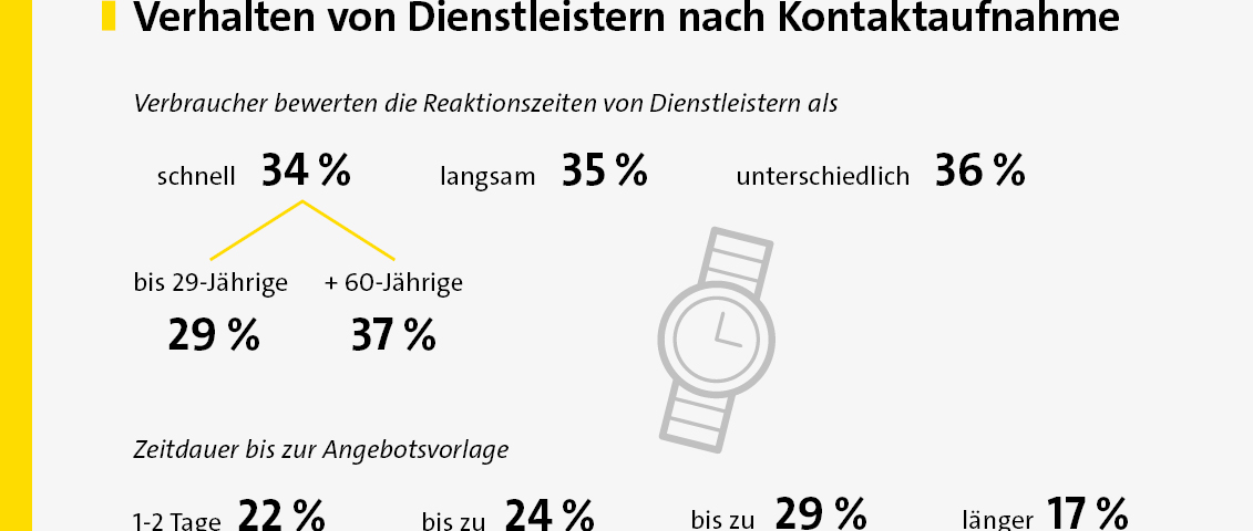 Dabei lässt die jeweilige Einschätzung auch eine unterschiedliche Erwartungshaltung in den verschiedenen Altersgruppen erkennen: Während bei den bis 29-Jährigen nur 29 Prozent der Meinung sind, dass sich Handwerker und andere Dienstleister in der Regel schnell auf Anfragen hin melden, scheint die Altersgruppe 60+ etwas gelassener zu sein. Hier beurteilen 37 Prozent die Reaktionszeiten der kontaktierten Fachleute als zügig.