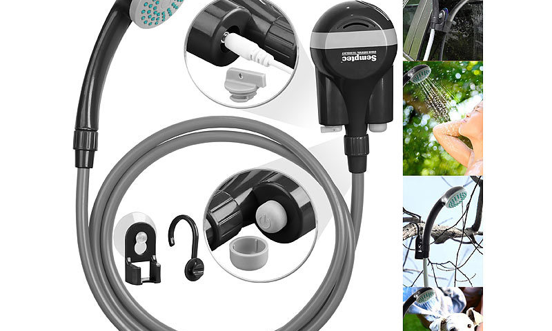 Der Outdoor-Begleiter für die schnelle Körperpflege: Die kompakte Akku-Camping-Dusche von Semptec Urban Survival Technology hat man dank kleiner Maße und geringem Gewicht immer und überall dabei. Der Duschkopf lässt sich ganz einfach mit dem Haken an einem Ast oder per Saugnapf an glatten Flächen befestigen.