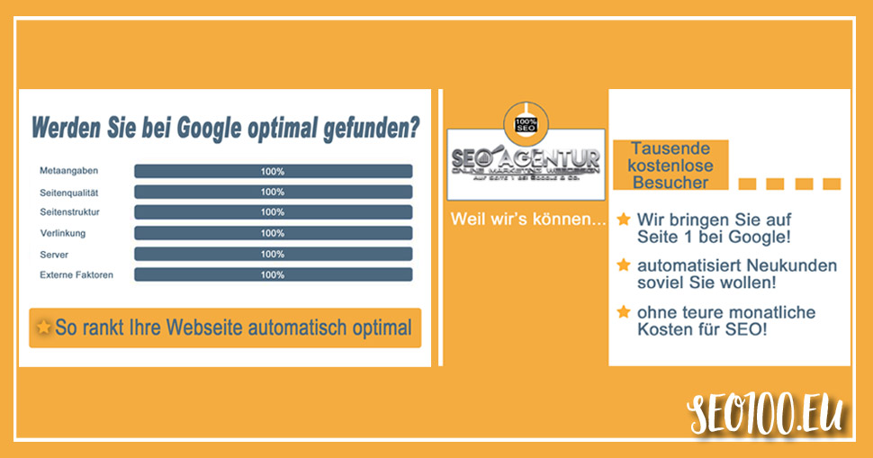 Wir bringen Ihre Webseite auf Seite 1 bei Google, ohne teure, monatliche Kosten für unnütze SEO Maßnahmen. Wir sprechen die Sprache der Suchmaschinen zu 100% und ranken so JEDE Webseite optimal ohne weiteres Zutun. Seit 1994 erstellen und optimieren wir Webseiten und sind aus gutem Grund die SEO Agentur, die 100% SEO beherrscht. Unsere SEO Scores unserer und die von uns erstellten Webseiten sprechen für sich und sind auf unserer Webseite www.seo100.eu einzusehen.