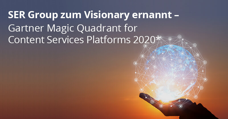 (20.11.2020 – Bonn) Die SER Group, ein führender Anbieter von ECM- und Content-Services-Plattformen, freut sich bekanntzugeben, dass Gartner sie erneut zum „Visionary“ im Magic Quadrant for Content Services Platforms (CSP) 2020* ernannt hat. Der Report bewertet 18 CSP-Anbieter auf Grundlage ihrer „Ability to Execute“ und „Completeness of Vision“. SER ist wieder der einzige deutsche Anbieter, der von Gartner in den Magic Quadrant 2020 aufgenommen wurde – und das bereits zum 5. Mal.
