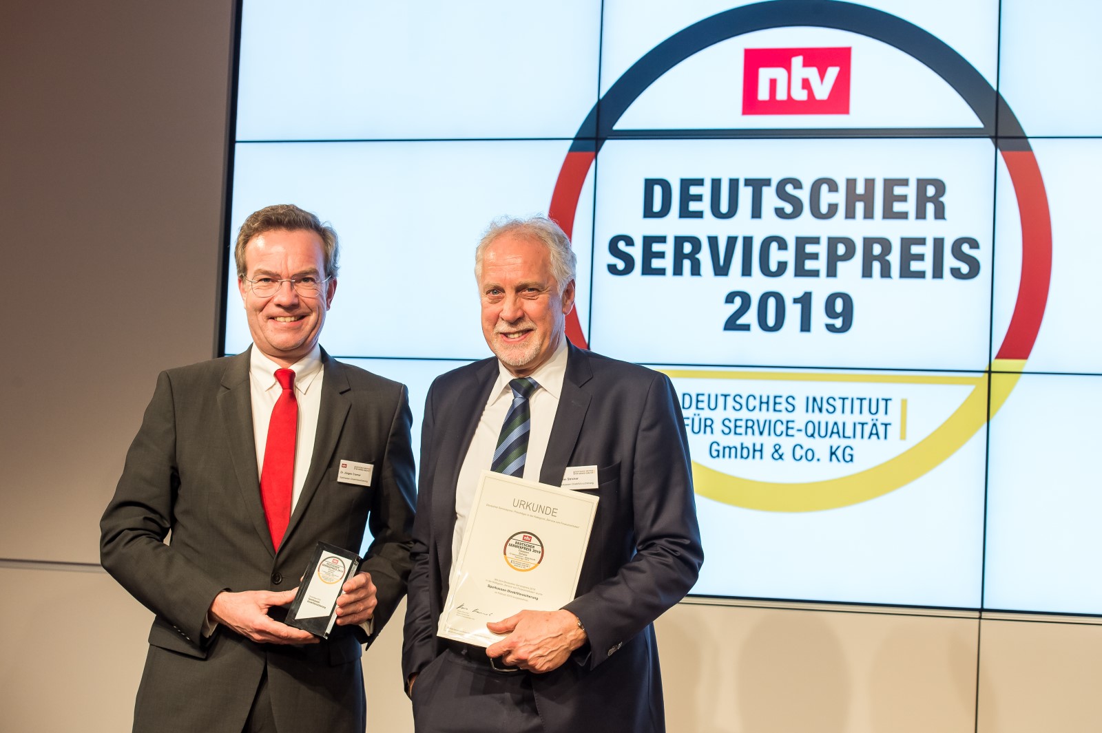 Düsseldorf/Berlin, Februar 2019. „Ich freue mich für alle Mitarbeiterinnen und Mitarbeiter, die wieder einen guten Job gemacht und unser Unternehmen vorbildlich repräsentiert haben“, resümiert Dr. Jürgen Cramer, Vorstandsmitglied der Sparkassen DirektVersicherung (S-Direkt), nachdem er gemeinsam mit dem Leiter des Service-Centers Achim Stricker erneut die Auszeichnung erhielt. Zur feierlichen Preisübergabe lud das Deutsche Institut für Service-Qualität (DISQ) in die Berliner Bertelsmann-Repräsentanz. In 48 Studien und Verbraucherbefragungen wurden insgesamt 501 Unternehmen in Kooperation mit dem Nachrichtensender n-tv untersucht und anhand rund 21.000 verdeckter Testkontakte und Kundenmeinungen bewertet.