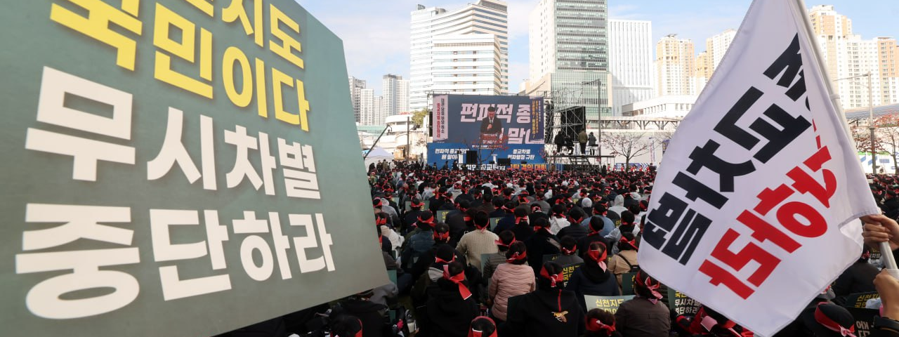 Die Shincheonji-Kirche Jesu hielt vor dem Amtssitz der Provinzregierung Gyeonggi eine Versammlung mit Zehntausenden von Teilnehmern ab, um gegen eine einseitige, religiös unterdrückende Handlung zu protestieren. Sie richtete ihren scharfen Protest gegen die Provinz Gyeonggi und die Tourismusbehörde der Provinz, die gegen Artikel 20 der Verfassung verstoßen haben soll, der die Religionsfreiheit und die Trennung von Religion und Politik garantiert.