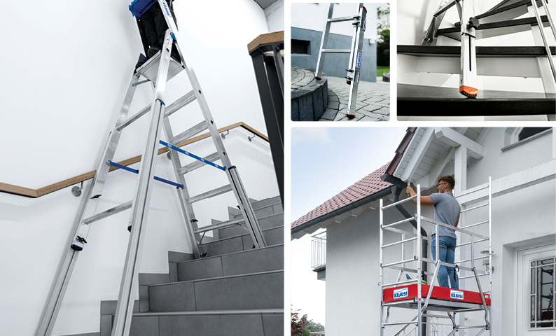So vielfältig wie das Produktportfolio des Branchenführers ist auch die Auswahl an KRAUSE Steigtechnikprodukten mit integriertem Höhenausgleich. Neben Stufen- und Sprossenleitern, Vielzweckleitern, Podestleitern und Fahrgerüsten (fahrbare Arbeitsbühnen), die zum Teil serienmäßig treppengängig sind, können viele weitere KRAUSE Steigtechnik-Produkte durch Sicherheitszubehör für den Einsatz auf Treppen und Absätzen erweitert werden.