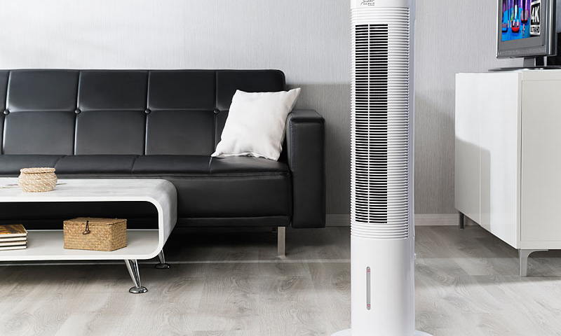 Schafft auch ein angenehmes Raumklima: Der Turmventilator von Sichler Haushaltsgeräte befeuchtet die Luft in den Räumen. Und der auswechselbare Staubfilter entfernt Schmutz-Partikel aus der Luft.