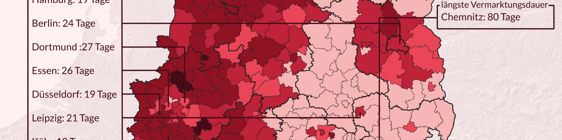 Die längste Vermarktungsdauer im Jahr 2023 verzeichnen vor allem Regionen in Sachsen und Sachsen-Anhalt. In der sächsische Stadt Chemnitz werden Kleinwohnungen mit 80,1 Tagen am längsten vermarktet. Im Vorjahr betrug die Angebotsdauer hier 97,1 Tage.