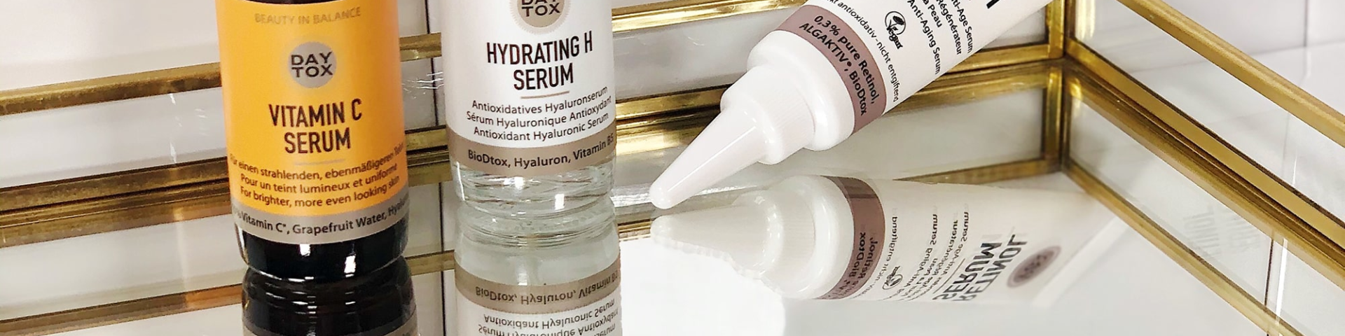Nachdem deine Haut gereinigt wurde, fährst du mit den weniger reichhaltigen, feuchtigkeitsspendenden Produkten fort. Eine ideale Grundlage bilden dabei Seren mit ihrer leichten Textur und hochkonzentrierten Inhaltsstoffen. Tagsüber eignen sich Seren mit Hyaluron oder Vitamin C sehr gut. Da sich deine Poren nachts öffnen, solltest du abends ein reichhaltigeres Serum verwenden. Das hochwirksame Retinol Serum von DAYTOX dringt mit 0,3% reinem und verkapseltem Retinol tief in die untersten Schichten deiner Haut ein und unterstützt deine Kollagenproduktion. Außerdem stärkt es deine Hautbarriere und reduziert Hautschäden, die durch UV-Strahlung verursacht wurden. Der hochwirksame Wirkstoff Algaktiv® klärt verstopfte Poren und reduziert Unreinheiten. Beachte, dass sich deine Haut zunächst langsam an den Powerwirkstoff Retinol gewöhnen muss. Bei regelmäßiger Anwendung wird die Zellerneuerung angeregt und du wirst mit einer rundum erneuerten, jünger aussehenden Haut belohnt!