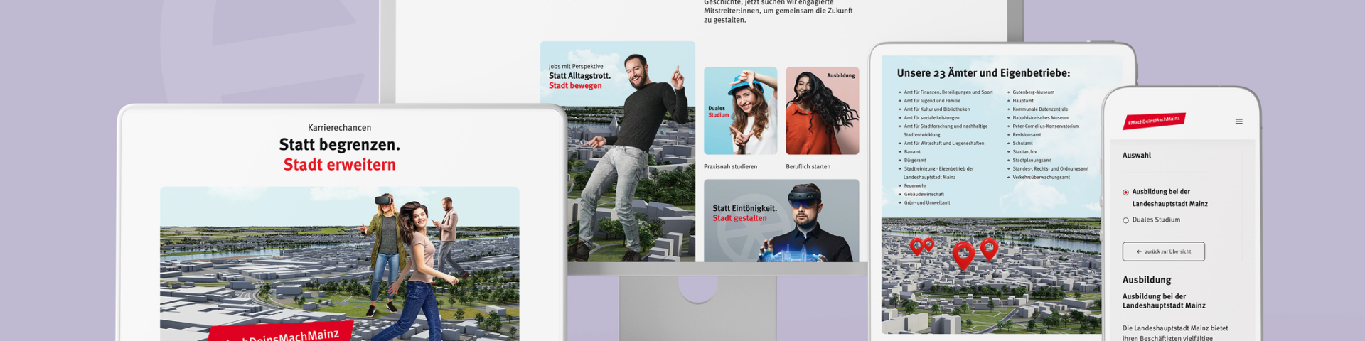 Unter „machdeins-machmainz.de“ informiert die Stadt ab sofort über die vielfältigen Jobmöglichkeiten in ihren 23 Ämtern und Eigenbetrieben. Ziel ist es, motivierte und qualifizierte Talente anzusprechen, die mit ihrer Arbeit die eigene Region mitgestalten wollen. Das Angebot reicht von Ausbildung, über Duales Studium, über Berufseinstieg bis hin zu Stellen für Berufserfahrene oder Wieder- und Quereinsteiger:innen.