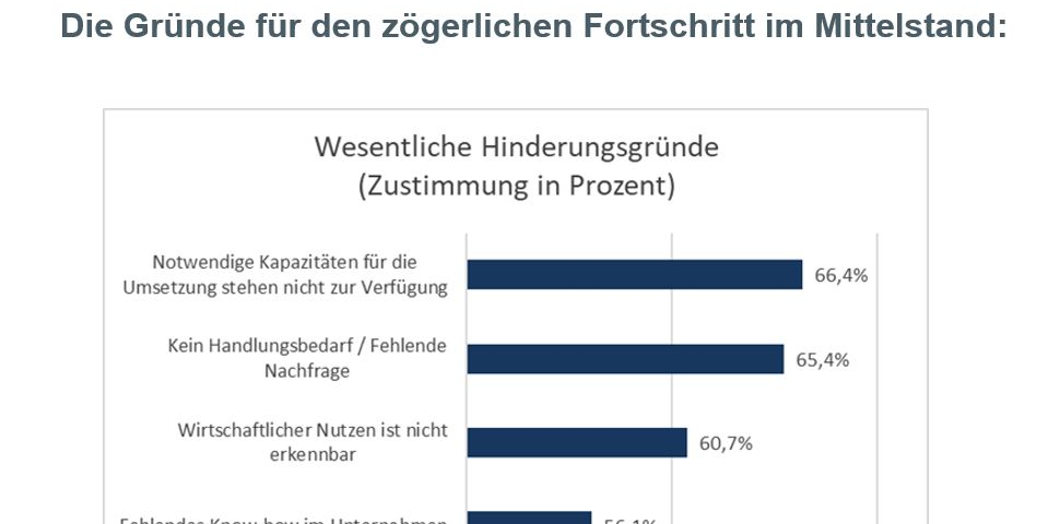 Die Erkenntnisse untermauert auch auch eine aktuelle Studie der Technische Hochschule Mittelhessen, die unter mittelständischen Unternehmen durchgeführt wurde. Es gab 107 teilnehmende Unternehmen. Hier wurde unter anderem der Status-quo der Digitalisierung der Geschäftsprozesse und -modelle beleuchtet.