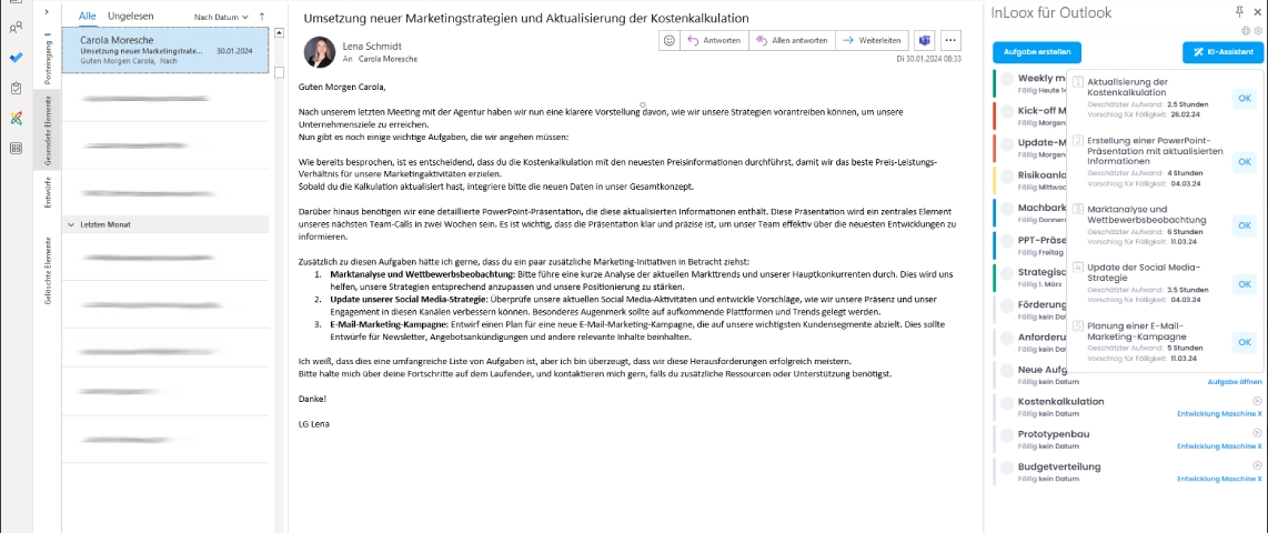 Ein KI-Assistent analysiert dann den Inhalt der E-Mails und auf Grundlage dessen werden Vorschläge für mögliche Aufgaben erstellt werden. Diese können dann übernommen oder modifiziert werden. Zudem schätzt die KI den benötigten Aufwand für die jeweilige Aufgabe und schlägt ein Fertigstellungsdatum vor. Angezeigt werden die Aufgaben in einem in Outlook integrierten Seitenpanel – sortiert nach Fälligkeitsdatum, so dass auf einen Blick erkennbar ist, was Priorität hat. Praktischerweise lassen sich die Aufgaben auch direkt im Seitenpanel bearbeiten. Per Drag & Drop können zudem Dokumente und E-Mail-Anhänge der Aufgabe hinzugefügt werden. Bei Bedarf kann unmittelbar aus einer Aufgabe heraus auch eine digitale Zeiterfassung gestartet werden.