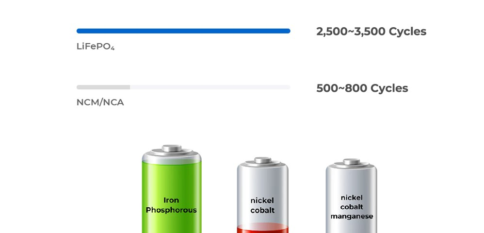 Die NMC-Batterien sind relativ leicht und haben eine höhere Energiedichte als LiFePO4-Batterien. Dafür bieten die LiFePO4-Batterien fast fünfmal so viele Ladezyklen wie NMC-Batterien und sind weniger anfällig für Brände.