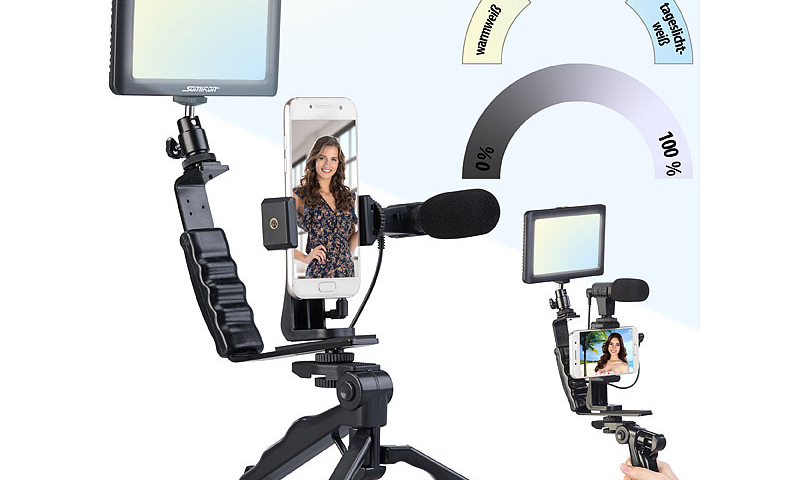 – 4-teiliges Vlog-Set bestehend aus LED-Videoleuchte, Mikrofon, Klemm-Halterung und Mini-Stativ inklusive 3,5 mm Klinkenkabel und deutscher Anleitung