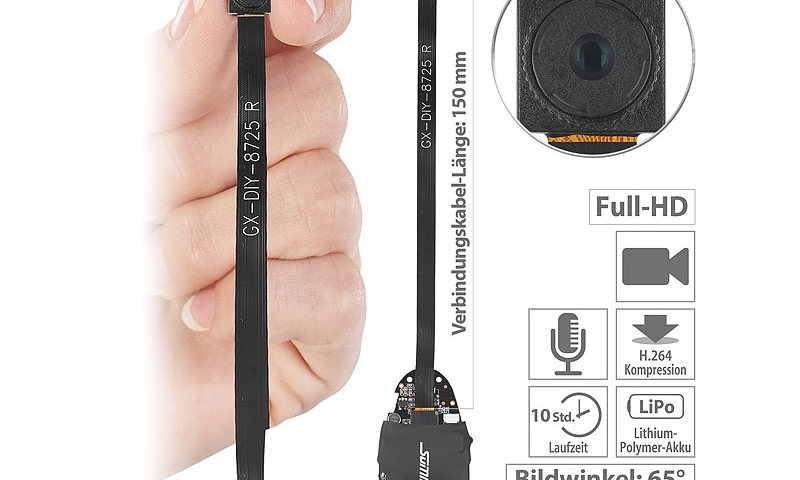 – Maße Kamerakopf: 9 x 9 x 2 mm, Steuereinheit: 55 x 26 x 2 mm, Verbindungskabel-Länge: 150 mm
