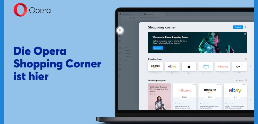Die Shopping Corner wurde in Zusammenarbeit mit lokalen Partnern entwickelt, um Online-Shopping so einfach und vorteilhaft wie möglich zu gestalten. Mit nur einem Klick haben Nutzer:innen nun Zugriff auf zahlreiche Tools, um beim Online-Shopping Geld und Zeit zu sparen. Die besten Angebote, aktuelle Gutscheine, beliebte Shops, Preisvergleiche, Einkaufstrends und Nachrichten befinden sich jetzt direkt in der Seitenleiste des Opera Browsers.