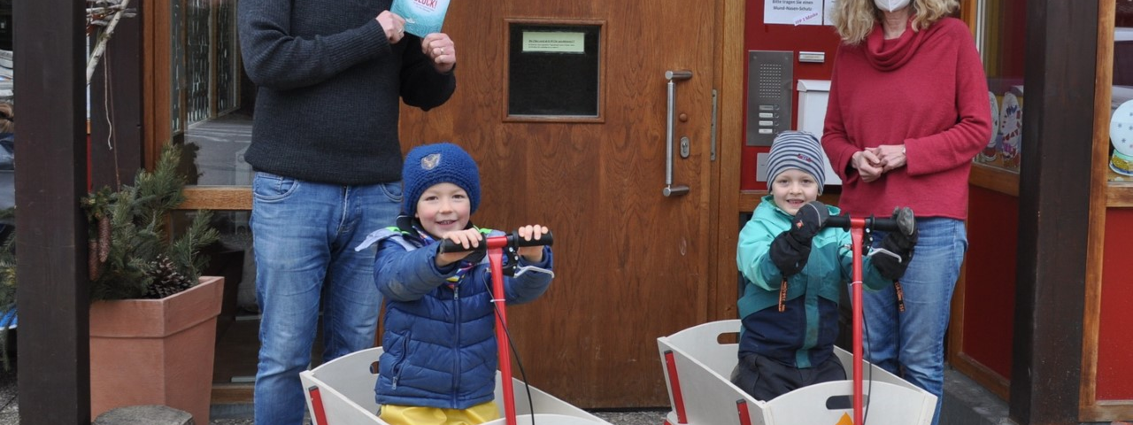 Der Kindergarten Mariä Himmelfahrt Grassau bekommt zwei neue Bollerwagen, gespendet aus dem Verkaufserlös des im November 2020 erschienen Buches