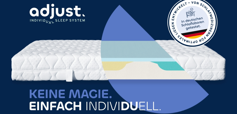 Erleben Sie individuellen Schlafkomfort mit der adjust Matratze. Dank modularer Anpassung und nachhaltiger Qualität wird jede Nacht zum erholsamen Highlight. Perfekt abgestimmt auf Ihre Körperbedürfnisse – entwickelt von Schlafmedizinern, gefertigt in Deutschland!