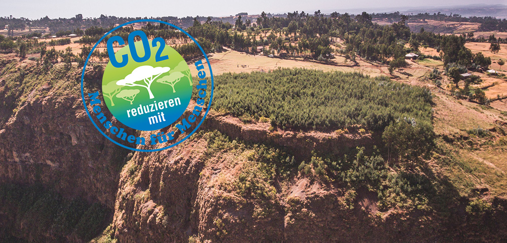 Mit den Beträgen zur Reduktion der ausgestoßenen Menge an CO2 lässt sich in Äthiopien viel bewirken. Menschen für Menschen setzt dabei auf integrierte Aufforstung und Nachhaltigkeit. Auf diese Weise verwandeln sich schon bald nach dem Anpflanzen der dafür in den Baumschulen von Menschen für Menschen gezogenen Setzlingen karge Landschaften in üppige Vegetation. Durch das Zusammenspiel mit weiteren Maßnahmen (z. B. Einbindung der lokalen Bevölkerung, Boden- und Wasserkonservierungsmaßnahmen, Gemüse- und Obstanbau) verbessert sich langfristig die Ernährungssicherheit einer ganzen Region. Anbauflächen sind vor Erosion geschützt und werden ertragreicher, Ernten fallen üppiger aus, die Menschen profitieren vielschichtig von den Erzeugnissen des Waldesund übernehmen daher freiwillig sehr schnell Eigenverantwortung, den entstehenden Wald langfristig selbst zu erhalten. Und genauso trägt die Aufforstung langfristig zur Bindung von CO2 und damit zum Klimaschutz bei.