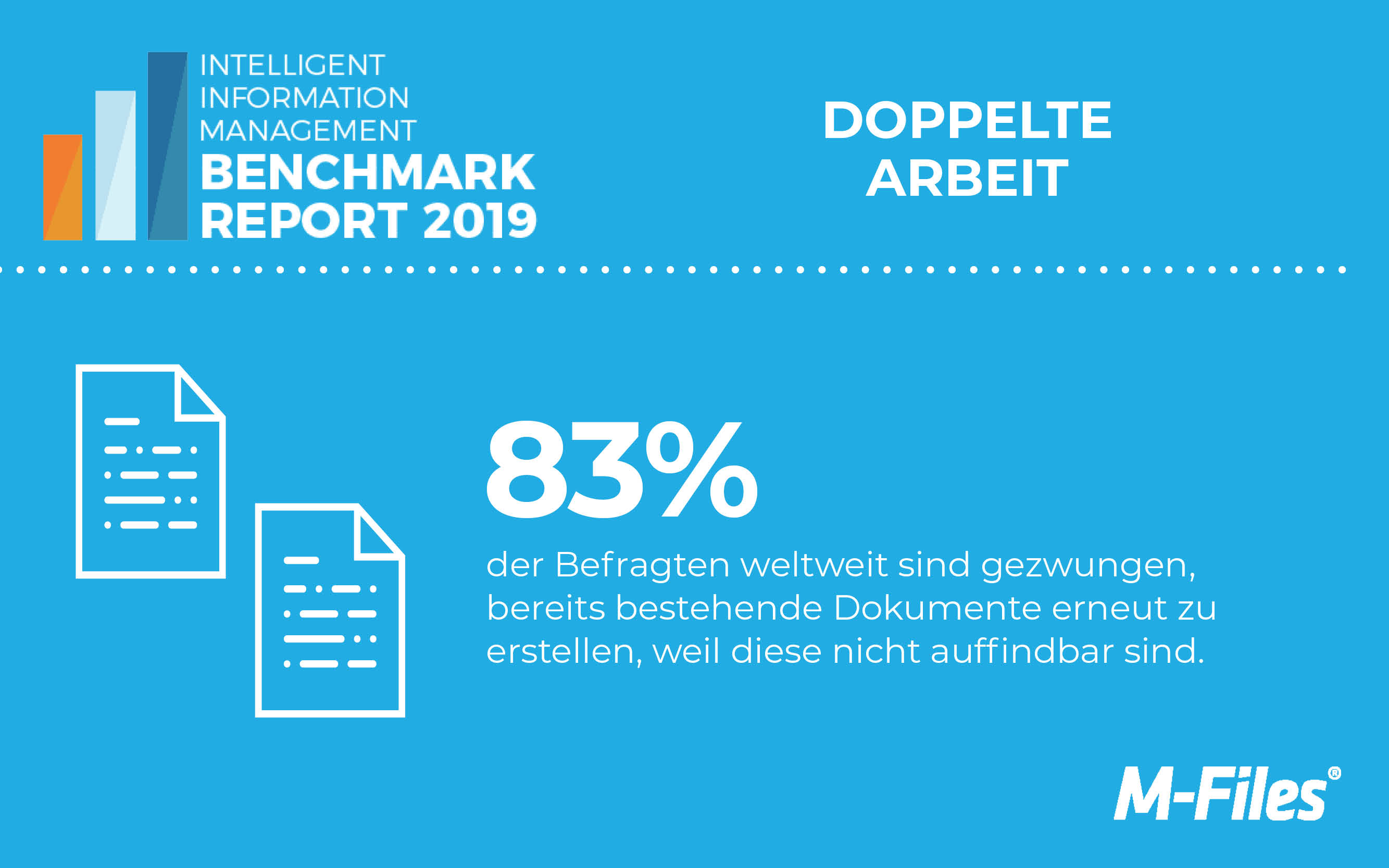 Eine weltweite Studie von M-Files zeigt, dass 8 von 10 Mitarbeitern bestehende Dokumente erneut erstellen, weil sie sie nicht wiederfinden, und 96 Prozent der Nutzer Schwierigkeiten haben, die neueste Version von Dokumenten zu erkennen.