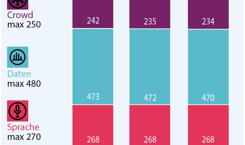 Bereits zum achten Mal in Folge erzielt die Swisscom den Gesamtsieg in der Schweiz und erreicht mit 983 von 1.000 möglichen Punkten erneut die Note „überragend“. Der Anbieter verbessert sich gegenüber dem Vorjahr um sechs Punkte – das ist auf diesem hohen Niveau bemerkenswert. Mit 975 Punkten erhält auch der zweitplatzierte Anbieter Sunrise die Note „überragend“. In der Sprach-Disziplin liegt der Netzbetreiber gleichauf mit Swisscom und Salt, in der Daten-Disziplin liegt Sunrise nur einen Punkt hinter Swisscom. Salt kommt auf Platz drei, mit 972 Punkten und der Note „überragend“. Mit einer Steigerung um 20 Punkte im Vergleich zum Vorjahr rückt der Anbieter auf nur noch 3 Punkte Abstand an Sunrise heran. Die Leistungen in allen Disziplinen sind top, beim 5G-Ausbau hat Salt vor allem auf dem Land zugelegt.