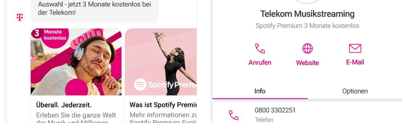 „Es war optimal, bei der Gestaltung der Kampagne und der Implementierung mit Infobip zusammenzuarbeiten, um eine Multimedia-Marketingkampagne zu entwickeln, die unsere Kunden anspricht und sie zu Audio-Streamern macht“, erklärt Thomas Welzel, Senior Proposition Manager Messaging, Deutsche Telekom. „Das Team von Infobip hat die Kampagnenziele verstanden und in Verbindung mit ihrer Chatbot-Plattform konnten wir RCS Business Messaging nutzen. Die Konversation mit Kunden fühlt sich genauso an, als wenn diese mit ihren Freunden chatten würden.“
