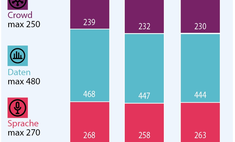 Der Blick auf die Schweiz zeigt drei „überragende“ Leistungen: Mit 983 Punkten erreicht Swisscom zum wiederholten Mal die Spitzenplatzierung. Sunrise folgt mit 975 Punkten auf Platz zwei, Salt mit 972 Punkten auf dem dritten Platz.