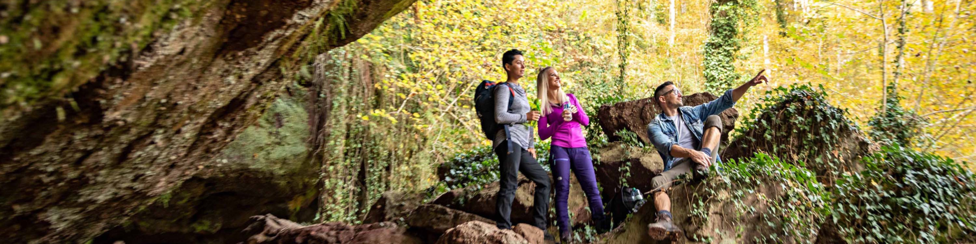 Benannt nach einem seiner Höhepunkte, dem Teufelsfelsen, ist der Teufelspfad ein Weg, der viele abwechslungsreiche Eindrücke bietet und sich für passionierte Wanderer ebenso eignet wie für Familien. Vom wildromantischen Tal mit Weihern und Bachläufen über bizarre Felsformationen bis hin zu zahlreichen Quellen und Wasserfällen darf sich der Teufelspfad mit gutem Recht „Premiumwanderweg“ nennen. Naturliebhaber entdecken entlang der Strecke die beeindruckende Flora und Fauna des FFH-Gebiets Gersbachtal, die sich in den natürlichen Lebensräumen Wasser, Buntsandsteinfelsen und Wald widerspiegelt. Moose, Farne und Gräser können entdeckt sowie zahlreiche Felshöhlen bestaunt werden. Vielleicht wohnt hier der Teufel persönlich? Sowohl im Frühjahr, wenn Blumen und Felder entlang der Route in voller Blüte stehen, als auch im Winter, wenn sich große Eiszapfen und -säulen in den sagenumwobenen Felsen bilden, hat der Teufelspfad seine besonderen Reize. Ausgangs- und Endpunkt ist das Naturfreundehaus Niedersimten, in dem Wanderer typische Pfälzer Gerichte genießen können und das für Kinder einen großen Spielplatz bietet.