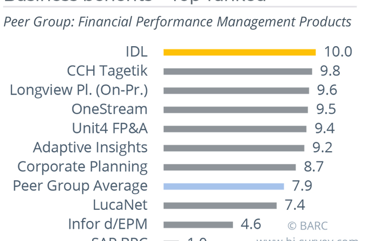 Der Spezialist für Financial Performance Management (FPM) aus Schmitten hat mit der IDL CPM Suite und ihren Modulen für Planung und Konsolidierung im aktuellen Planning Survey seine Position als ein marktführendes Finanzkonsolidierungs- und Planungsprodukt in der DACH-Region bestätigt. So erzielte IDL in den Peergroups „Financial Performance Management Products“, „BI-focused Products“ und „European Vendors“ insgesamt 12 Spitzenpositionen und 37 führende Platzierungen. In allen drei Vergleichsgruppen erreichte IDL gegenüber den direkten Mitbewerbern in den Bewertungskategorien Nutzen für Anwenderunternehmen (Business benefits) und Mehrwert für Anwenderunternehmen (Business value) den ersten Platz. Der Business value definiert sich aus dem Nutzen für Anwenderunternehmen, Projekterfolg (Project success) und Projektdauer (Project length).