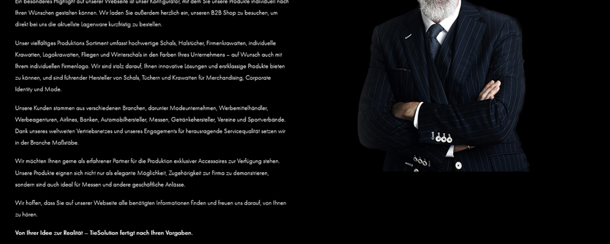 Die Image Seite www.tiesolution.org von Tie Solution ist eine umfassende Informationsplattform für B2B Kunden wie Werbemittelhändler, Industrie Kunden, Handelskunden, Werbeagenturen und andere. Sie bietet Informationen über die Produktionsprozesse der von Tie Solution hergestellten Accessoires wie Halstücher, Schals, Krawatten und ermöglicht den Kunden, Angebote direkt anzufordern.