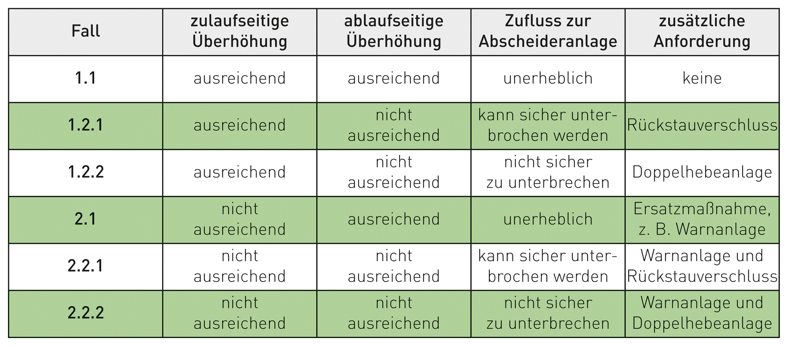Die Bezugshöhe für die Rückstauebene ist in der Ortssatzung festgelegt. Bei Abscheideranlagen für Leichtflüssigkeiten ist hierzu die Oberkante der niedrigsten Abdeckung in Bezug zu setzen. Die Höhendifferenz dieser beiden Niveaus bestimmt die nun zusätzlich zu beachtende, ablaufseitige „erforderliche Mindest-Überhöhung“.