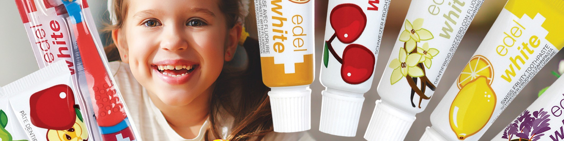 Vom ersten Zahn bis zum Zahnwechsel lernen Kinder, sich zweimal täglich die Zähne zu putzen. Lag es bisher häufig an zu scharfer Zahnpasta und großen Zahnbürsten, werden nun spielerisch Farben und Früchte den Wochentagen zugeordnet. Wer noch nicht schreiben kann, schmeckt den Wochentag! edel+white macht es Kindern ganz leicht. So ist z.B. „rot“ für „Montag“ und schmeckt nach „Kirsche“. Dazu die Ultrasoft-Zahnbürste für Mädchen und Jungen mit vielen weichen Konex-HD-Filamenten, die den Zahnschmelz und das Zahnfleisch schonen, aber alle Beläge und Verfärbungen sanft entfernen.